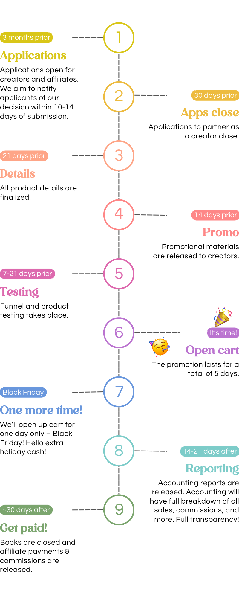 While the bundle has a pre-defined open cart period, we will re-open cart for 36 hours only. You are welcome to add this to your Black Friday promo, promote the bundle exclusively... or if Black Friday isn't your vibe, you can skip it all together. If you do choose to promote again, you'll receive a nice cash injection with 85% creator commission on your bundle plus 50% affilliate commision on any other bundle sales (since they all re-open) that come from you!